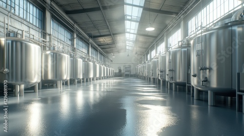 Industrial Brewery Interior Showcasing Stainless Steel Fermentation Tanks in Spacious Warehouse