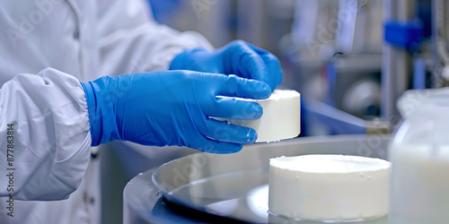 Industrial Cheese Production with Worker Handling Fresh Cheese , Modern Dairy Processing Facility Featuring Cheese Manufacturing
