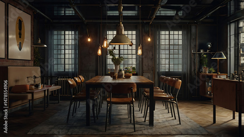 dining room, interior, industrial, design, table, chair, window, lighting, decor, style, furniture, modern, architecture, loft, apartment, home, room, brick, exposed, metal, pipe, wooden, leather, elegant, cosy, urban, roomy, stylish, vintage, atmosphere, detail, arrangement, light, shadow, setting, aesthetic, residential, space, gathering, meal, comfortable, inviting, artistic, beautiful, contemporary