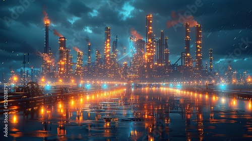 city, industrial, night, storm, rain, skyscraper, factory, smog, light, dark, water, wet, building, steel, concrete, pollution, urban, modern, future, futuristic, cloud, dramatic, gloomy, atmosphere, environment, digital, art, illustration, artwork, fantasy, concept, design