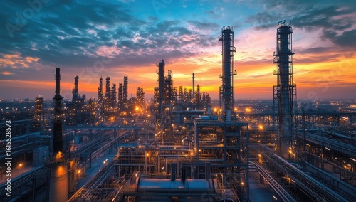 industrial, refinery, complex, factory, sunset, dawn, sunrise, oil, gas, petrochemical, chemical, pipe, tank, tower, infrastructure, machinery, equipment, metal, light, illuminated, night, aerial, view, city landscape, landscape, energy, production, manufacturing, modern, large, scale, industry, urban, pollution, environment, technology, global, economy, business, facility, operation, power, plant