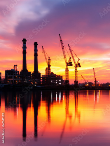 Industrial cranes and chimneys silhouetted against a vibrant sunset sky, reflected in calm water at a construction site or refinery.