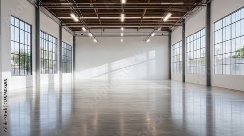 Industrial Elegance: A spacious white warehouse with sleek metal beams and tall windows, featuring polished concrete floors and a modern, minimalist design.