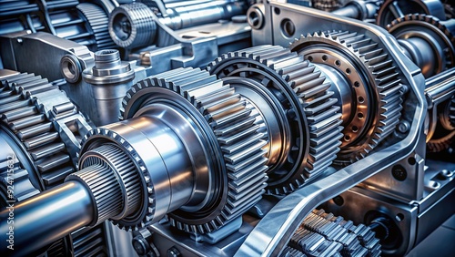 Industrial Elegance: Raw metal engine and transmission with exposed gears and polished accents.