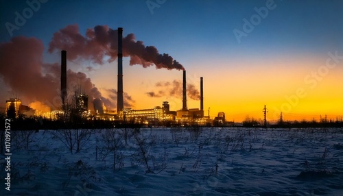 Industrial energy power plants working in crisis at dawn in cold winter with gas shortages and continued global supply chain issues