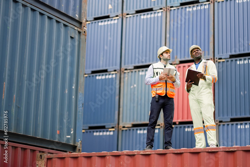 Industrial engineer worker working at overseas shipping container yard. Logistics supply chain management and international goods import and export concept..