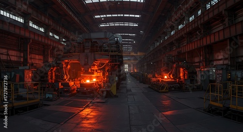 industry, factory, metal, manufacturing, machinery, internal, operation, detail, glow, facility, system, worked, create, warehouse, heating, setting, perspective, layout, work, producing, heavy, process, energy, large, automated, furnace, production, interior, location, casting, rolling, complex, structure, molding, light, technology, processing, infrastructure, engineering, modern, workspace, industrial, workshop, steel, metalwork, machine, continuous, design, ironwork