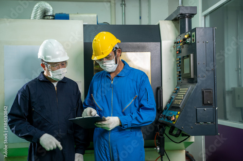 Industrial factory employee working and checking near electric meters panel of a control room in industry factory.