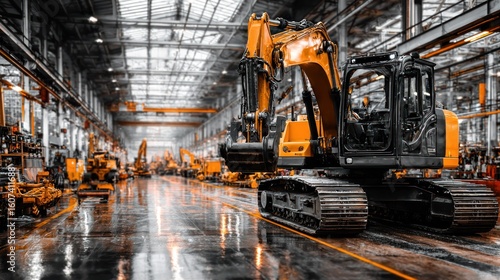 Industrial factory interior with large excavator