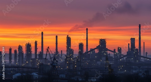 factory, industrial, silhouette, sunset, smokestack, machinery, power plant, urban, dusk, sky, cloud, orange, purple, dark, smoke, refinery, industrial complex, industrial zone, skyline, city landscape