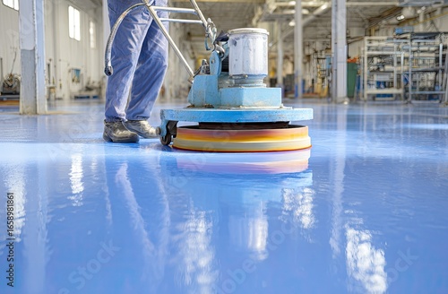 factory, floor, polishing, machine, men at work, blue, industrial, polished, smooth, concrete, maintenance, cleaning, equipment, large, facility, manufacturing, person, work, operating, professional, operation, workplace, business, clean, new