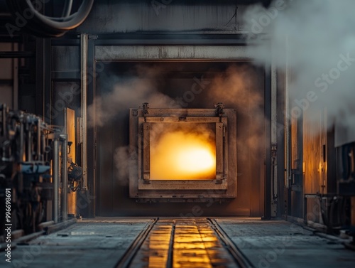 industrial, furnace, heat, treatment, ceramic, steam, light, orange, glow, hot, metal, factory, manufacturing, production, machinery, equipment, process, technology, automation, engineering, science, energy, power, welding, smelting, workshop, heavy, metalworking, steel, men at work, environment, material, fabrication, innovation, profession, business, plant, workflow, facility, site, job, labor, operation, safety, maintenance, efficiency, quality