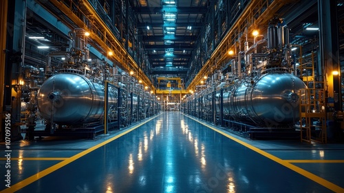 industrial, factory, manufacturing, machinery, equipment, tank, pipe, metal, steel, warehouse, workshop, production, technology, engineering, infrastructure, construction, industry, energy, power, automation, process, heavy, modern, clean, stainless, silver, shiny, reflective, bright, light, dark, blue, yellow, floor, line, path, perspective, long, wide, empty, space, organised, maintenance, repair, operation