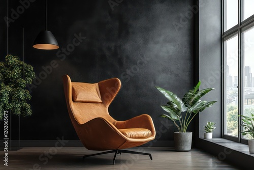 industrial, loft, brown, leather, lounge, chair, dark, moody, lighting, black, accent, wall, contemporary, decor, realistic, illustration