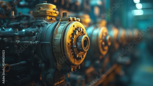 Industrial Machinery: Close-up of intricate engine components in a factory setting, showcasing gears, bolts, and metallic textures