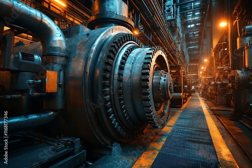 factory, industrial, machinery, equipment, plant, engine, gear, steel, metal, technology, manufacturing, production, industry, power, energy, mechanism, engineering, construction, heavy, machine, large, structure, component, system, pipe, tube, wire, cable, automation, process, work, operation, interior, building, corridor, lighting, dark, shadow, perspective, detail, texture, background, image, photo, electricity, drive, shaft, cog, wheel