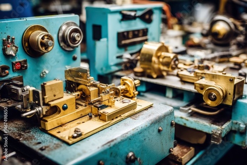 Industrial machinery with intricate brass components and a vintage aesthetic.