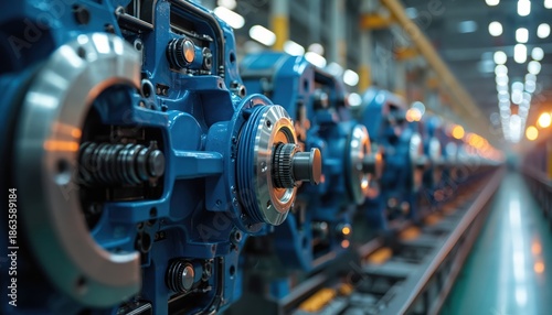 Industrial machines in a factory line. Blue metal units with gears and circular elements. Production, manufacturing, engineering, technology, heavy industry.