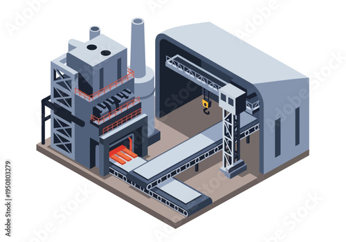 Industrial manufacturing plant with automated conveyor belt and crane for production processes