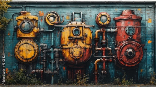 wallpainting, art, street, graffiti, wall, urban, industrial, rust-eaten, pipe, machine, metal, detail, design, vintage, colours, blue, yellow, red, texture, background, background, steel, artwork, construction, structure, object, geometric, pattern, retro, creative, style, photo, inspiration