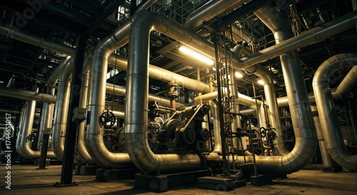 Industrial Network: An intricate network of metallic pipes and machinery, indicative of industrial operations and processes, fills the frame