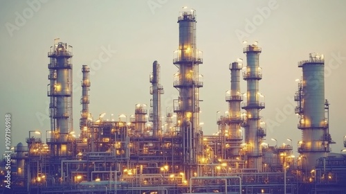 Industrial Oil Refinery at Dusk, Lit by Golden Lights