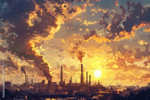 industrial oil refinery silhouetted against a dramatic sunrise sky with golden clouds, steam rising from cooling towers