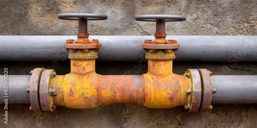 rust, pipe, industrial, metal, old, plumbing, corrosion, pipeline, connection, ageing, weathered, vintage, grunge, infrastructure, closeup, detailed, texture, red, brown, yellow, grey, concrete, wall, background, rough, worn, dirty, gritty, urban, machinery, equipment, factory, engineering, system, control, turn off, handle, crank, aged, decay, neglected, abandonment, damage, maintenance, repair, construction, supply