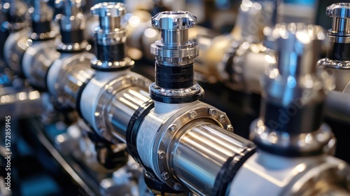 Industrial Piping System: Close-up of Polished Metal Pipes and Valves in a Modern Facility