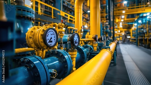 Industrial plant gauges monitor pipelines, yellow pipes in background