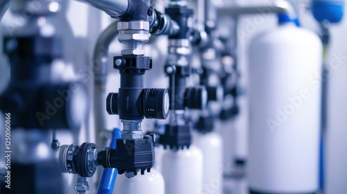 Industrial plant piping system close-up; valves, pressure gauges; cleanroom background; process control