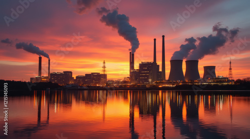 Industrial power plant with smoke rising from chimneys