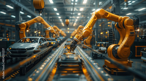 Industrial robotic arms assembling cars on a high-tech production line, showcasing advanced automation and manufacturing technology.