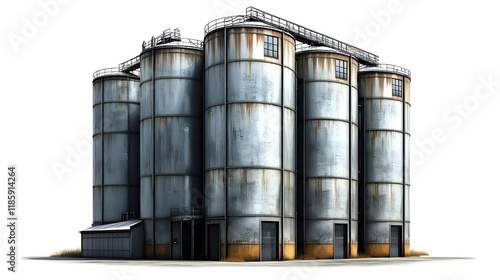 industrial, metal, steel, storage, grain, farm, agriculture, building, rust-eaten, weathered, architecture, industry, tank, factory, rural, isolated, structure, container, exterior, old, large, cylindrical, equipment, tower, warehouse, grunge, concrete, sky, background, white background, outdoors, landscape, infrastructure, supply, farming, harvest, food, production, processing