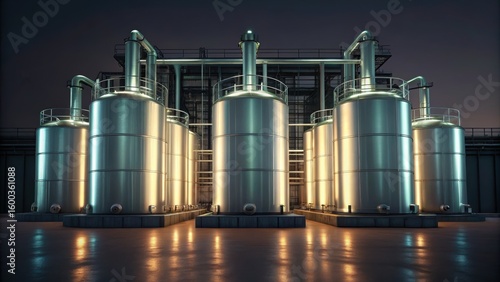 Industrial storage tanks illuminated at night, showcasing a modern facility with metallic surfaces and pipes.