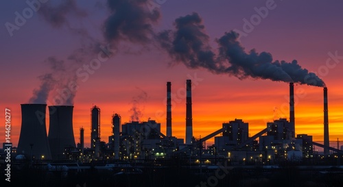 industry, sunset, silhouette, power, plant, energy, pollution, smoke, stack, chimney, industrial, complex, factory, manufacturing, production, electricity, generation, coal, fossil, fuel, environment, climate, change, global, warming, emission, air, quality, landscape, horizon, sky, orange, dark, night, tower, building, infrastructure, technology, heat, steam, atmosphere, conservation, sustainability, renewable, alternative, resource, impact, effect, damage