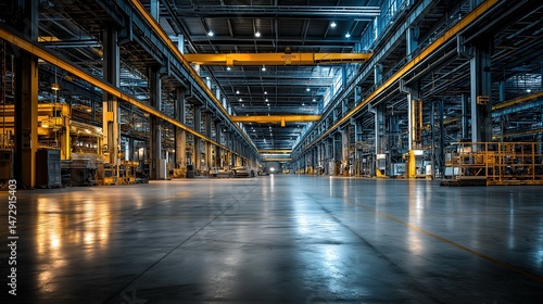 Industrial warehouse with concrete floors and steel beams, showcasing raw urban aesthetics and depth.