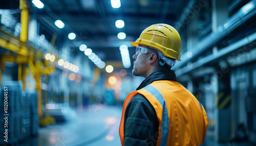 Industrial Worker in Safety Gear Inspecting Modern Factory | Manufacturing, Safety Equipment, Hard Hat