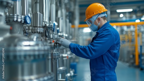 factory, industrial, men at work, machinery, equipment, manufacturing, production, plant, safety, helmet, mask, glove, steel, metal, pipe, gauge, control, inspection, maintenance, engineering, technology, blue, safety-gear, chemical, pharmaceutical, industry, industrial plant, factory, process, automation, control, quality, mill-hand