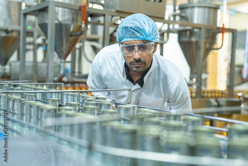 Industrial worker monitoring cans on a conveyor belt, emphasizing focus, productivity, and adherence to safety and quality control standards in a professional factory setting.