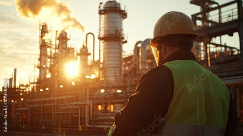 Industrial Worker Overseeing Sunset at Oil Refinery