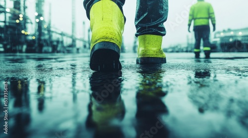 industrial, men at work, walking, puddle, rain, refinery, boot, safety, waterproof, wet, weather, industry, occupation, job, work, employment, labor, blue-collar, manufacturing, production, energy, oil, gas, crude oil, fuel, power, construction, site, environment, outdoors, water, closeup, foot, leg, uniform, yellow, green, puddle, industrial plant