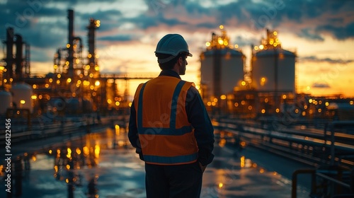 Industrial worker wearing safety gear at refinery during sunset