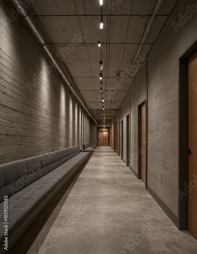 Industrieller Flur mit Betonwänden und modernen Holzbänken