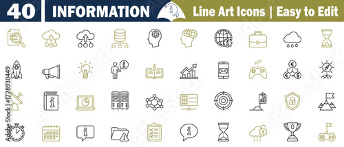 information, datum, icon, line art, technology, communication, business, finance, rocket, megaphone, light bulb, book, chart, graph, smartphone, controller, money, compass, satellite, server, target, shield, flag, mountain, stopwatch, calendar, folder, cloud, lock, trophy, binocular, globe, brain, question mark, download, upload, wi-fi, database, briefcase, coin, electronic mail, strategy, research, document, search