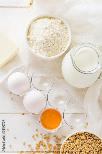 Ingredients for baking: flour, milk, wheat grain, butter and eggs on white wooden background. Selective focus