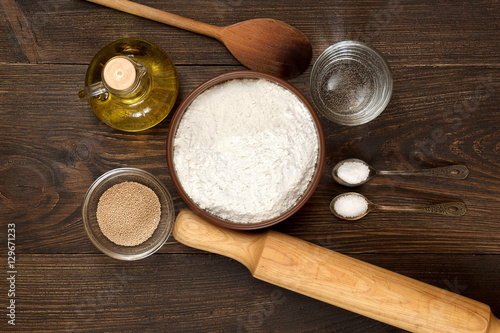 ingredient, pizza, dough, flour, top, view, utensil, rustic, homemade, rolling pin, table, tool, food, bakery, yeast, sugar, water, salt, oil, white, spoon, italian, cooking, bowl, up high, preparation, pastry, kitchen, wooden, receipe, vintage, traditional, glasses, bottle, old, brown, dark, baking, background