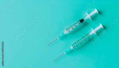 Injection cosmetology. Two medical syringes on turquoise background, top view