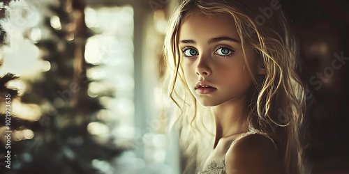 Innocence and Wonder: A young girl with piercing blue eyes gazes intently, her blonde hair cascading around her shoulders, capturing a moment of childlike curiosity and vulnerability.
