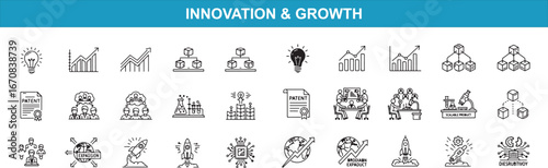 Innovation and growth icons set featuring business strategy, solution, development, technology, progress, concept, success, and future